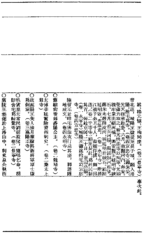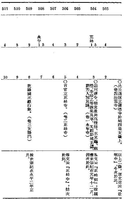 (1)「洛陽伽藍記」原書乃是一部記述北魏拓跋氏王朝遷都洛陽後政治與社會的寫實史籍,有很多材料可以補充正史。但因體例所限,讀此書者有時感到記事分散,對于歷史發展的連續性關係不易全面瞭解。本表的編製即為適應這一要求,及便利省覽之用。所輯材料全以原書為限。