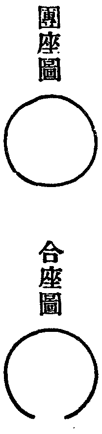 圓形坐者。此名團座。圓形坐而開一方者。此名合座。 此圖見敕修清規雲桃解方丈特為新掛搭茶處。