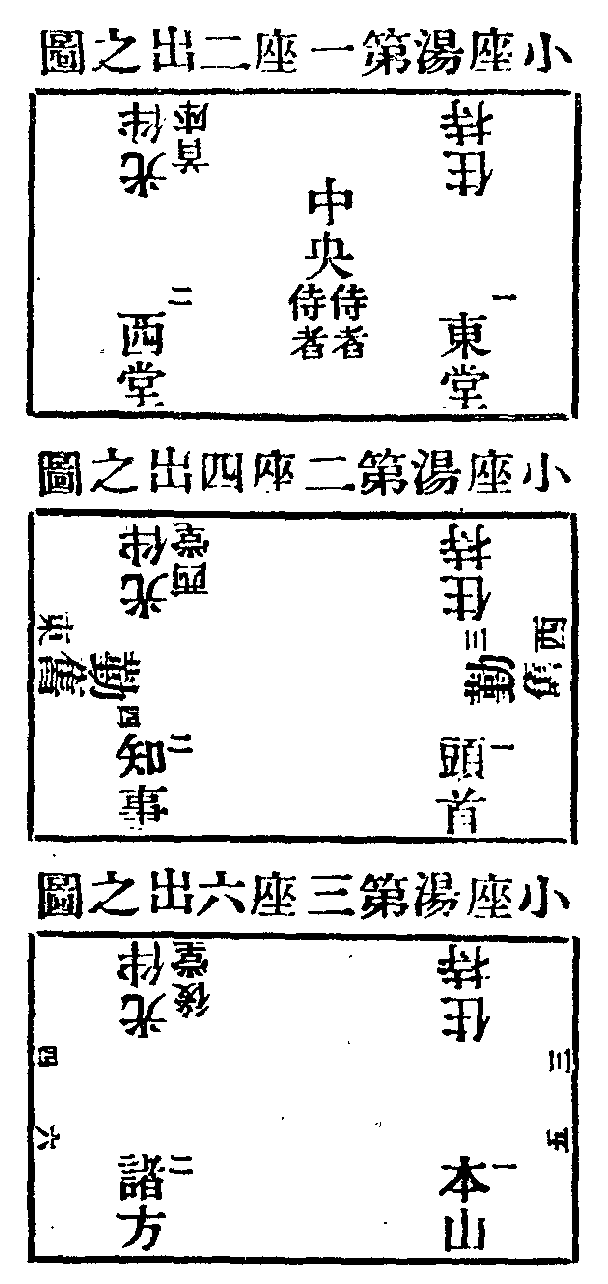 敕修清規方丈小座湯云。四節講行。按古有三座湯。第一座分二出。特為東堂西堂。請首座光伴。第二座。分四出。頭首一出。知事二出。西序勤舊三出。東序勤舊四出。西堂光伴。第三座位。多分六出。本山辦事。諸方辦事。隨職高下分座。職同者次之。首座光伴。