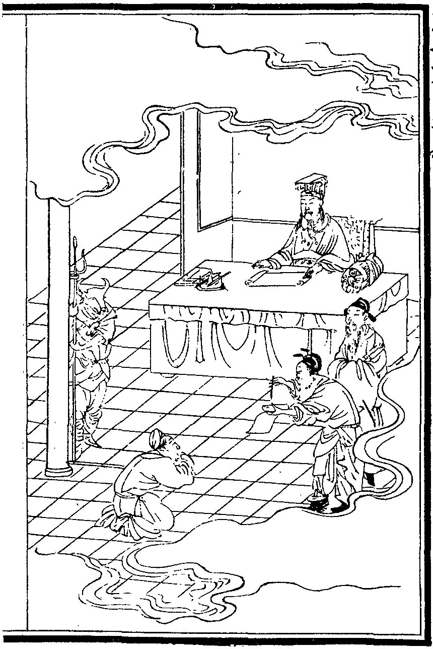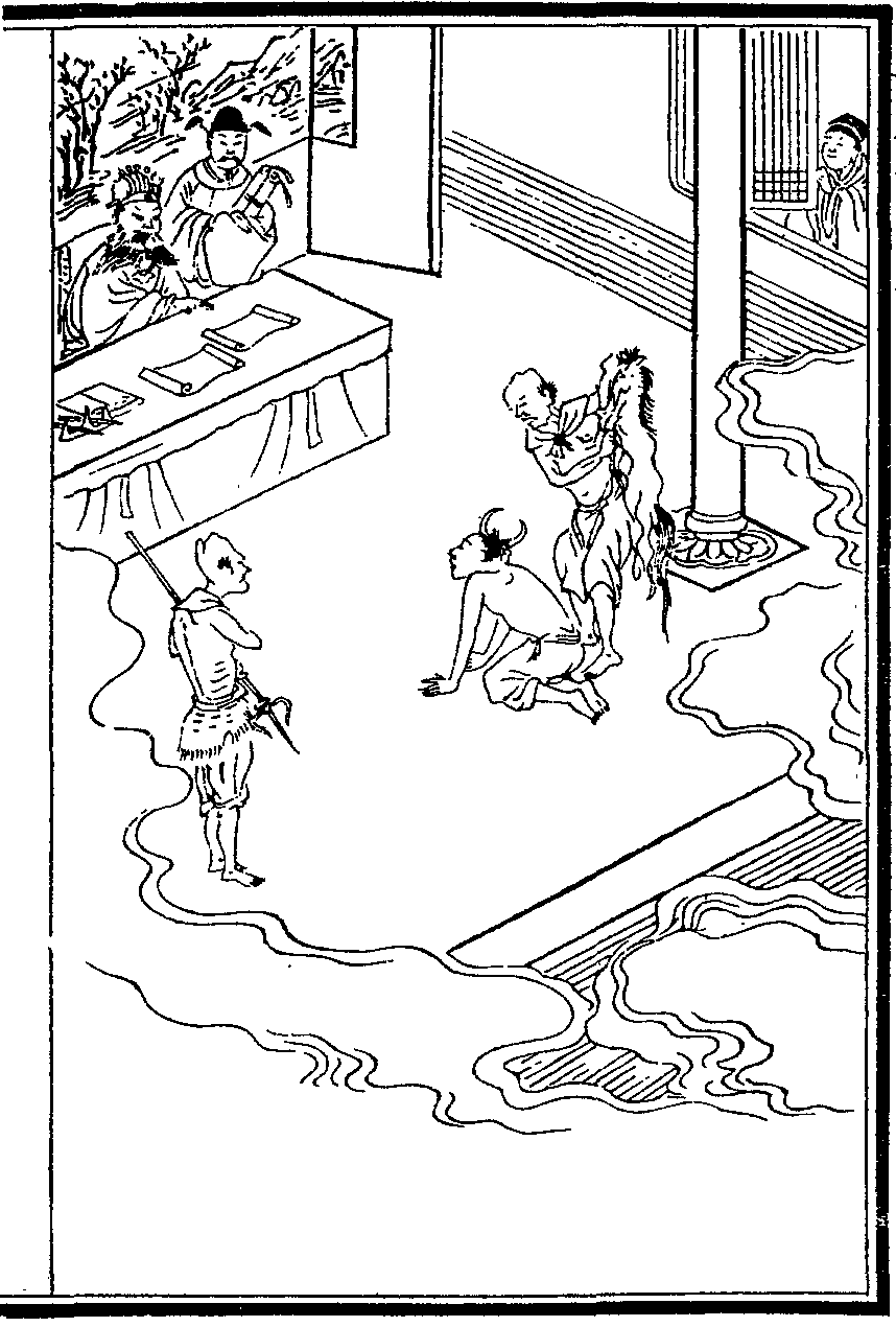 明宋進朝西安貢生謁選入京寓閻王廟左廊下一夕閻王升殿朝往潛視見其妻舅戴牛角跪曰所謀某人財某家產俱已變牛償訖王曰汝亦有他善宜復人身吏又捧籍上王檢閱改色曰汝白使某某錢大小尚有四宗速變畜還完方有人身之望其妻舅泣曰勿為牛可耳王許之押令披馬皮出殿去朝心駭汗浹回家延高僧超度