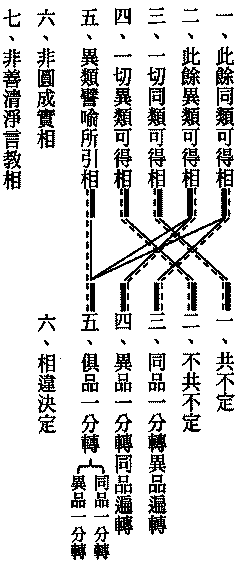 一者、此餘同類可得相,二者、此餘異類可得相,三者、一切同類可得相,CC003n0003_p0123a07四者、一切異類可得相,五者、異類譬喻所引相,六者、非圓成實相,七CC003n0003_p0123a08者、非善清淨言教相。
