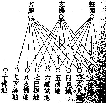 CC005n0005_p0019a02┌一乾慧地 三乘之初,同名乾慧,通是外凡。未有理水,故名為乾。CC005n0005_p0019a03 │ 與藏教五停心,總別等三位齊。CC005n0005_p0019a04 聲聞┤二性地 三乘之人,得相似無漏性水,通名內凡。薄有似解,故名為性。CC005n0005_p0019a05 │ 伏見思惑,與藏教四善根齊。CC005n0005_p0019a06 │三八人地 三乘信法二行,體見假發真斷惑,在無間三昧中,八忍具足,智少一分。CC005n0005_p0019a07 │ 止觀云,人者,忍也。忍,因也。從世第一,轉入無間三昧,故名八人。CC005n0005_p0019a08 │ 見真諦理,與藏教初果齊。CC005n0005_p0019a09 支佛┤四見地 三乘同斷見惑八十八使,見第一義無生四諦之理,與藏教初果齊。CC005n0005_p0019a10 │五薄地 三乘之人,體愛假即真,發六品無礙,斷欲六品,證解脫。欲惑稍輕,故名為薄。CC005n0005_p0020a01 │ 與藏教二果齊。CC005n0005_p0020a02 │六離欲地 三乘之人,體愛假即真,發真無漏,斷下五分結盡。欲惑全破,故名離欲。CC005n0005_p0020a03 │ 與藏教三果齊。CC005n0005_p0020a04 菩薩┤七已辦地 三乘之人,體色無色愛即真,發真無漏,斷上五分結。三界事惑究竟,智斷功畢,CC005n0005_p0020a05 │ 故言已辦。與藏教四果齊。CC005n0005_p0020a06 │八支佛地 緣覺發真無漏,功德力大,福慧深利,故能侵除習氣。習未都盡,故名為侵。CC005n0005_p0020a07 │ ○已上二乘共位,但能無住,不能生心者也。CC005n0005_p0020a08 │九菩薩地 菩薩之人,先修從假入空觀,破斷見思,入於無住。由是從空入假,福慧深利,CC005n0005_p0020a09 │ 道觀雙流。觀二諦,進斷習氣。色心無知,得法眼道種智。乃至學佛力無畏等法,CC005n0005_p0020a10 │ 殘習將盡,唯餘少灰。既能自利,復能利人。不唯無住,又能生心者也。CC005n0005_p0020a11 │十佛地 大功德力,資利智慧,得一念相應慧。觀真諦究竟,習亦究竟。CC005n0005_p0020a12 │ 如劫火燒木,無復炭灰。坐七寶菩提樹下,以天衣為座,現帶劣勝應身成佛。CC005n0005_p0020a13 │ 為三乘根性,轉無生四諦法輪。緣盡入滅,畢竟灰斷。CC005n0005_p0020a14 │ 是則菩薩,先入無住,後學生心。生心已竟,後證真無住。CC005n0005_p0020a15 └ 復用真生心,畢歸無住而已矣。