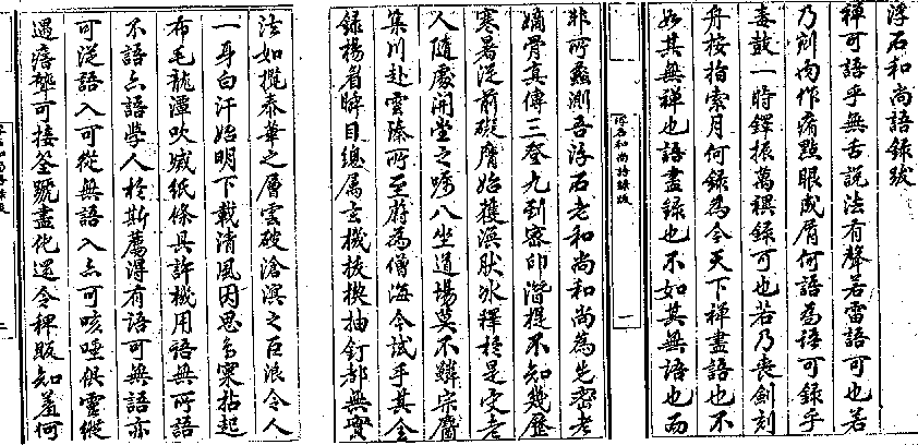 J26nB185_p0572a02浮石禪師刻福城語錄竟,請余為之J26nB185_p0572a03序,既而檇李、松陵、廣陵諸會語錄次J26nB185_p0572a04第刻成,復以全錄序為請。余之序福J26nB185_p0572a05城錄也,舉善財南詢因緣,謂師於妙J26nB185_p0572a06峰頂上親見德雲,了畢大事。再舉文J26nB185_p0572a07殊採藥因緣,拈出師一片老婆心,與J26nB185_p0572a08四海禪宗點眼,此中是草?是藥?能殺J26nB185_p0572a09人?能活人?明眼人試一著眼,如數家J26nB185_p0572a10珍、如觀掌果,福城一會如是,檇李、松J26nB185_p0572a11陵、廣陵諸會語錄亦復如是;即由此J26nB185_p0572a12陞座說法,坐盡此世界微塵剎數道J26nB185_p0572a13場亦一一如是。故知師雖坐福城,不J26nB185_p0572a14起於座,而歷檇李、松陵、廣陵諸會;師J26nB185_p0572a15雖現說福城語錄,不動舌本而遍說J26nB185_p0572a16檇李、松陵、廣陵諸會語錄。何處不是J26nB185_p0572a17草?何處不是藥?何一味不能殺人?不J26nB185_p0572a18能活人?東澗老人自笑舌頭短,為此J26nB185_p0572b01老作福城語錄序如是,乃至作諸會J26nB185_p0572b02語錄序亦復如是。若於此處會得,正J26nB185_p0572b03不妨一莖草上定綱宗也。老人說是J26nB185_p0572b04言已,有人笑曰:「文殊師利勸善財南J26nB185_p0572b05行,於妙峰山頂求見德雲,善財至德J26nB185_p0572b06峰經七日已,迺見德雲比丘於別山J26nB185_p0573a07經行自在,公于福城諸會見浮石和J26nB185_p0573a08尚,安知和尚在德峰住地耶?在別山J26nB185_p0573a09經行耶?佛不云乎:「如人持尺量虛空。」J26nB185_p0573a10復有人隨計其數:「公將持尺量虛空J26nB185_p0573a11乎?抑亦將隨後而計其數乎?」余聞之J26nB185_p0573a12大笑,并書之以為敘。