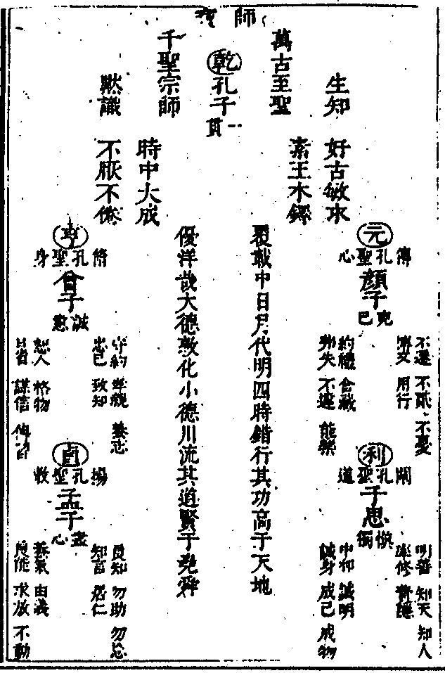 自開闢來,神聖繼天立極、參贊位育者,始終不過盤J34nB311_p0787b02古統十二人,如一日有十二時,一年有十二月,推之J34nB311_p0787b03萬古,常不忒也。特立此圖,懸象昭示,則吾與萬世聖J34nB311_p0787b04神儼然同堂未散,可不自觀自察而奮勵之哉?今人J34nB311_p0787b05所以不能為神聖者,以心幾不能精一,師法不能時J34nB311_p0787b06中,知行不能大成,所以人心愈殘,治道愈亂,世情愈J34nB311_p0787b07迷,終難反古也。神聖能善用易道而自治治人,以知J34nB311_p0787b08陰陽偏勝而成迷亂,乃使剛柔相濟、水火交資,故性J34nB311_p0787b09情中和而天地化育也。使人能一心皈依此聖教師,J34nB311_p0787b10于十二時中不至偏勝,則人心可純、道術可正,長夜J34nB311_p0787b11可以復旦矣。孟子云:「養心莫善于寡欲。」正以世人多J34nB311_p0787b12欲而自雜亂,故不能帥一其志氣以充塞乎天地。所J34nB311_p0787b13以古之欲明明德於天下者,必先專其格致而寡其J34nB311_p0787b14所欲,始能充此大欲以從心而不踰矩也。噫!此九一J34nB311_p0787b15之宗,庸詎非萬古寡君寡師之所以寡欲寡過于天J34nB311_p0787b16下之道也哉?