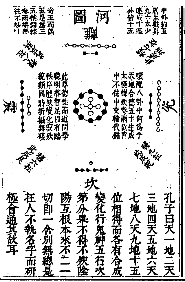 J34nB311_p0787c08河圖,天包地也,一六三八,二七四九,運于四方,五與J34nB311_p0787c09十居中,以圓涵方。天道下降,陽生于下,始北次東,故J34nB311_p0787c10一與三生數居之;自內而外,歷南終西,故七與九成J34nB311_p0787c11數居之。地道上升,陰生于上,始南次西,故二與四生J34nB311_p0787c12數居之;自內而外,歷北終東,故六與八成數居之。