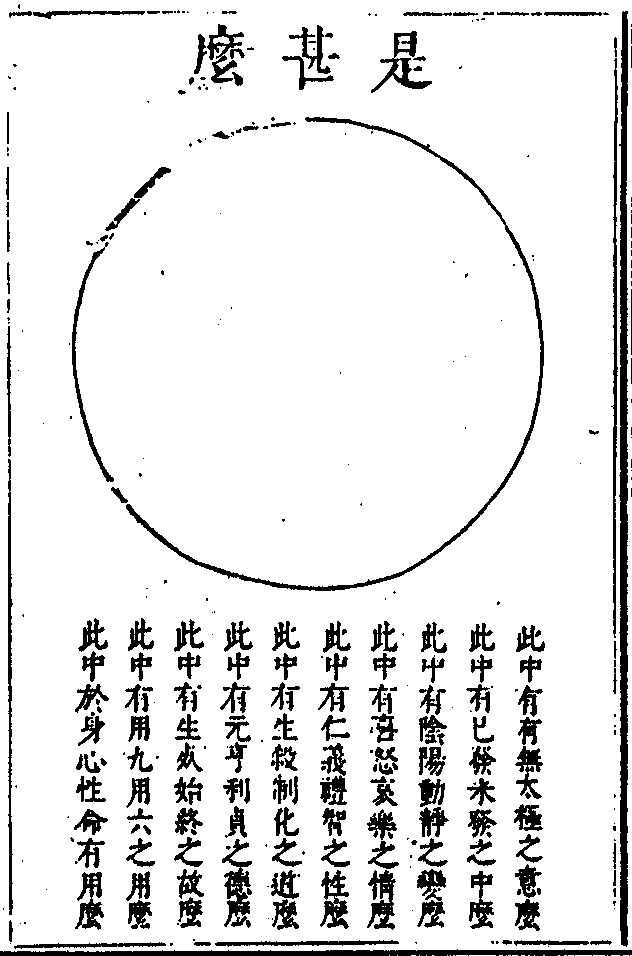 J34nB311_p0790b05伏羲止畫此圖,未嘗標出太極。孔子標出之,而隨即J34nB311_p0790b06曰:「一陰一陽之謂道,繼之者善也,成之者性也。」祗如J34nB311_p0790b07此圖,何者是道?何者是善?何者是性耶?綸之則一卦J34nB311_p0790b08有一卦之時義,一爻有一爻之時義,絲毫不亂;彌之J34nB311_p0790b09則渾淪周遍,隨舉一物,皆全具也。神無方而物有則,J34nB311_p0790b10本自方圓同時,非默成神明者,孰能知之?