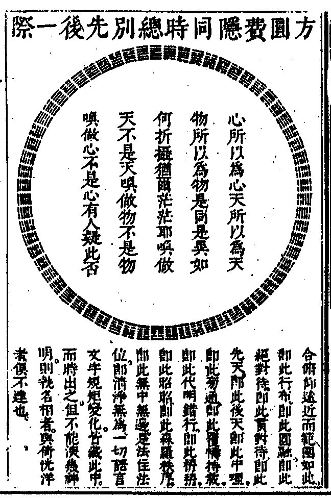 先天明體而用,卦爻自內而生;後天明用而體,卦爻J34nB311_p0789a02自外而生。此太極、兩儀、四象、八卦,及六十四爻爻,皆J34nB311_p0789a03具太極體用。在人之性命心身,與物形世界,無論太J34nB311_p0789a04小正偏,亦莫不全具太極體用。以人不自知,故念念J34nB311_p0789a05昧此體用。惟聖人於念念爻爻,知慎此獨,故能率修J34nB311_p0789a06而參天地;於念念爻爻,精一此中,故能致格而享天J34nB311_p0789a07命也。