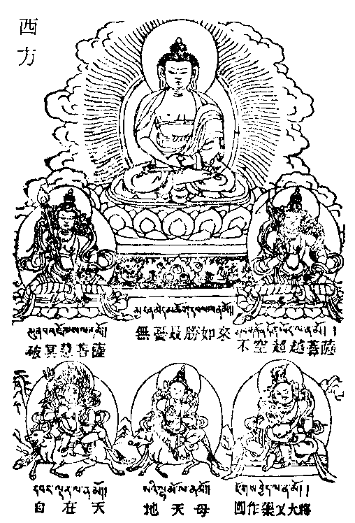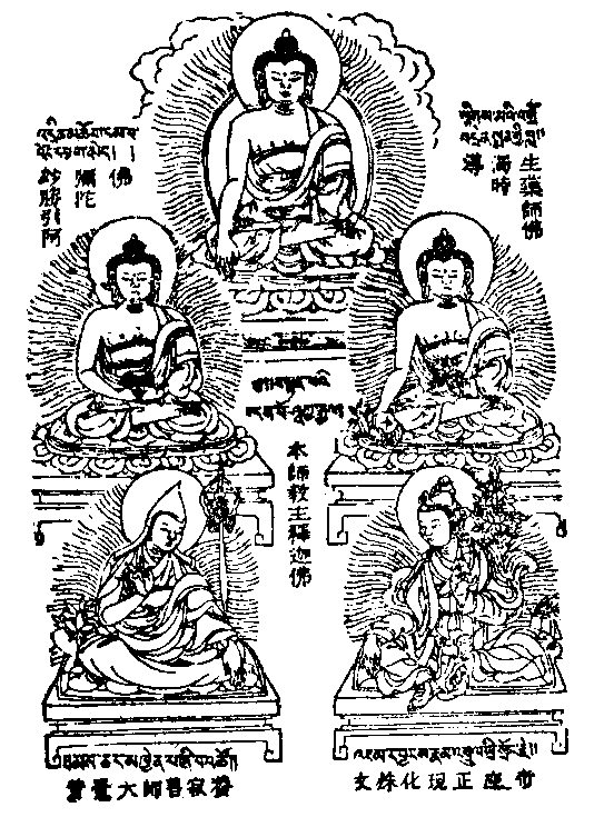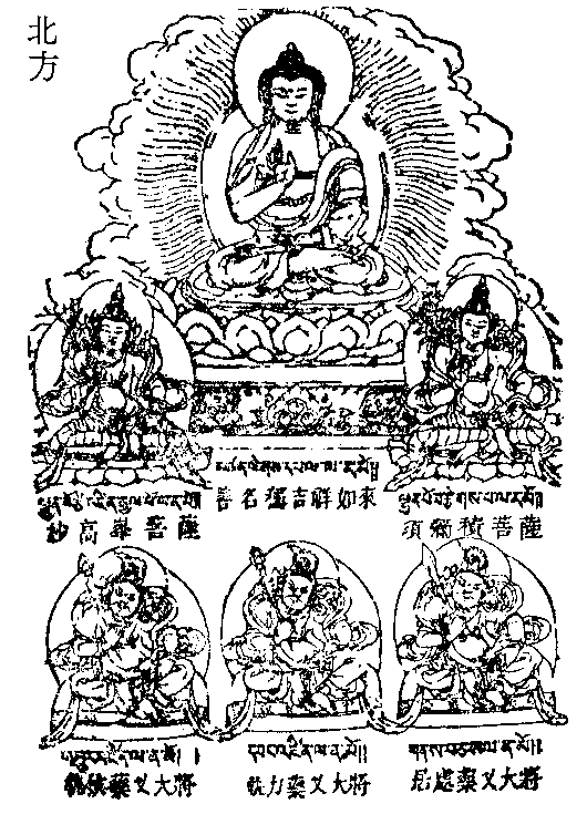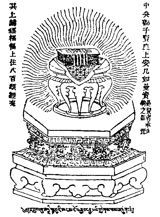 凡製儀軌雖多,今遵佛子無著賢德師所著之式,上台中央獅子寶座上,安几如曼資形,其上鋪經幅,幅上住八百頌經夾;東方安釋迦牟尼佛,黃色,右手鎮地印,左手正定印;南方威音王如來,黃色,右手施願印,左手正定印;西方無憂最勝如來,淺紅色,二手等持印;北方善名稱吉祥王如來,黃色,右手施無畏印,左手正定印;東北隅藥師琉璃光王如來,藍色,右手施願印,持阿嚕喇菓即訶子也,左手正定印,上安鉢盂;東南隅金色無垢如來,黃色,二手說法印;西南隅法海雷音如來,淺紅色,二手說法印;西北隅法海勝慧遊戲神通如來,紅色,右手施願印,左手正定印。以上八如來相,俱披金紅法衣,相好莊嚴結金剛跏趺坐。