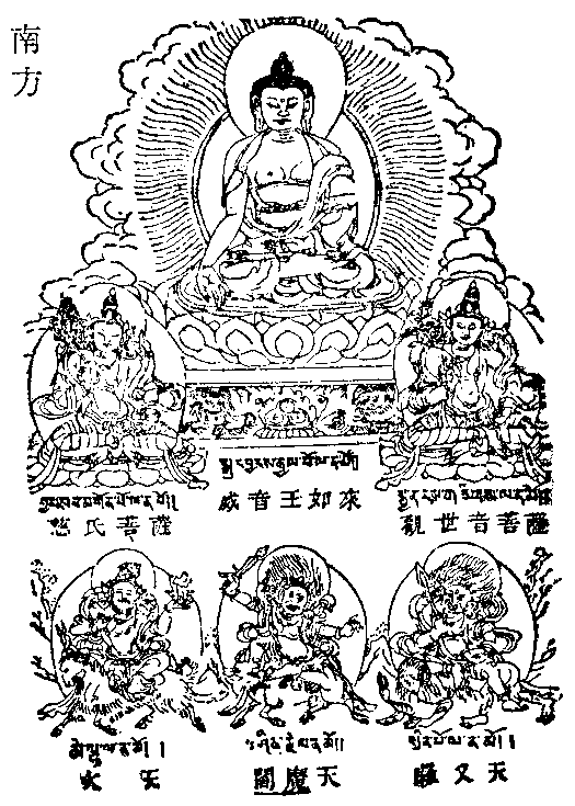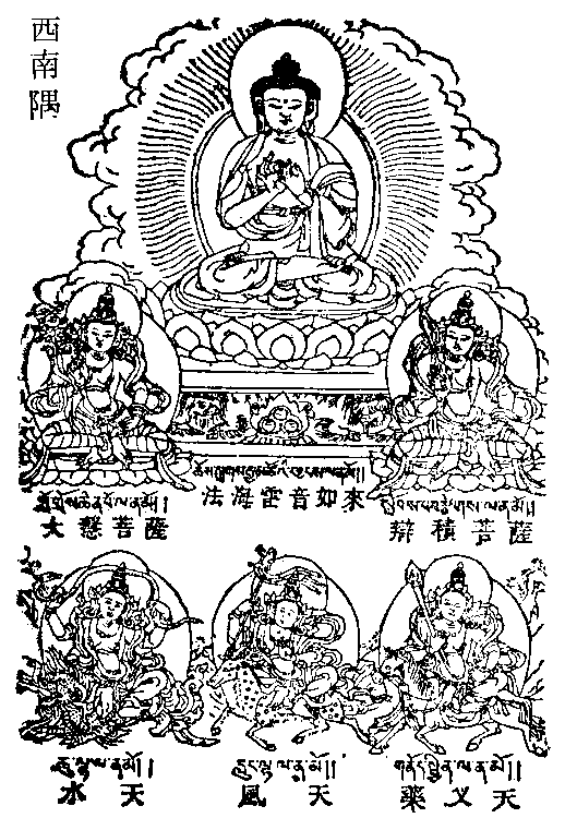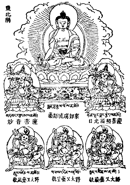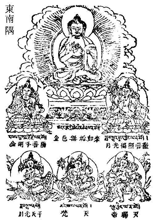 東門內右列車坐上,日光天子,紅色,二手擎日輪;其左鵝座上,月光天子,白色,手持月輪;次鵝座上梵天,四面黃色,右手持輪,左手持寶瓶;東南隅象座上,帝釋天,白色,持杵;南方山羊座上火天,紅色,手持火爐;水牛座上閻摩天,藍色,持捧;起屍座上囉叉天,青色,持劍;水獸座上水天,白色;二手持蛇索;西南隅鹿座上風天,淺藍色,持風旛;西方馬座上藥叉天,黃色,持捧;牛座上自在天,白色,持叉;猪座上地天母,黃色,二手持瓶。彼等諸天,頭戴寶冠身著天衣。