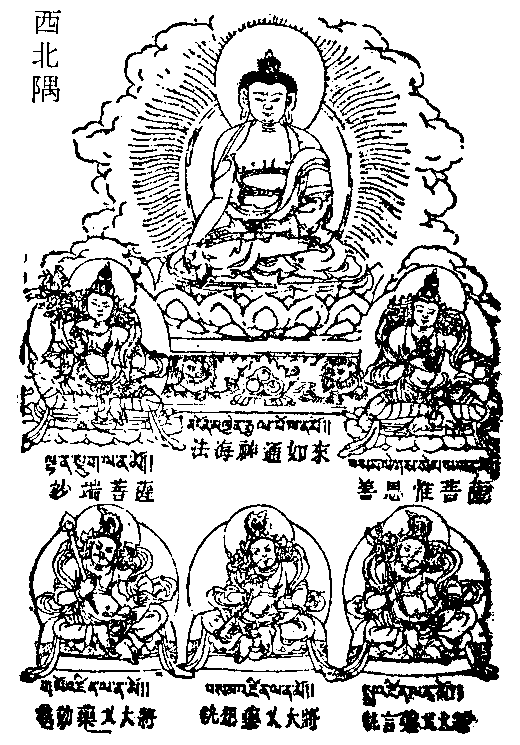中台蓮華瓣上,東方正座,安文殊菩薩相,金紅色,左手持經,右手執劍;其右邊救脫菩薩,白色,二手金剛拳印,按于兩𦜮,微慢相而坐;東北隅日光遍照菩薩,金紅色,右手執烏𮅵拉花,花上安梵夾,上嚴日輪相,左手金剛拳印,按于𦜮上。文殊之左金剛手菩薩,綠色,右手執杵當胸,左手持寶鬘;東南隅月光遍照菩薩,白色,右手執烏𮅵拉花,花上安梵夾,上嚴月牙相,左手金剛拳印,按于𦜮上。此外十一大持菩薩,依本經序所載者,南方正坐安觀世音菩薩相,白色,手執蓮華,其左大慧菩薩,黃色,手執蓮華,上嚴一目;其右慈氏菩薩,黃色,手執龍華樹,上嚴軍遲即澡瓶也;西南隅辯積菩薩,白色,手執劍;西方正坐不空超越菩薩,白色,手執劍;其左妙端菩薩,白色,手執蓮華樹,上嚴梵夾其上嚴寶珠;其右破冥慧菩薩,白色,手執杖;西北隅善思維菩薩,白色,手持寶瓶;北方正座須彌積菩薩,白色,手執蓮華樹,上嚴月牙相;其左微妙音菩薩,淺藍色,手執烏𮅵拉花,上嚴杵及焰寶珠;其右持妙高峯王菩薩,黃色,手執寶穗。此十一尊菩薩相,右手各結自印當胸,左手金剛拳印扶𦜮,眾寶莊嚴,身著各色天衣,具柔善相,菩薩跏趺而坐。