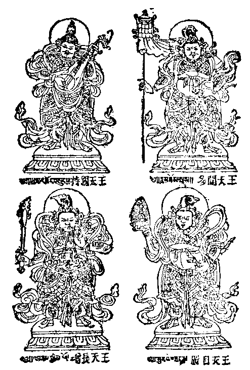東門中持國天王,白色,二手持琵琶;南門中增長天王,藍色,持劍;西門中廣目天王,紅色,持蛇索;北門中多聞天王,黃色,持寶鼠。以上四天王,頭戴寶冠,身著天衣,兩足並立。如是等相,不論香藥木泥畫塑皆可,金銀造之尤妙,惟須宗儀軌布列為要,皆面向中央。
