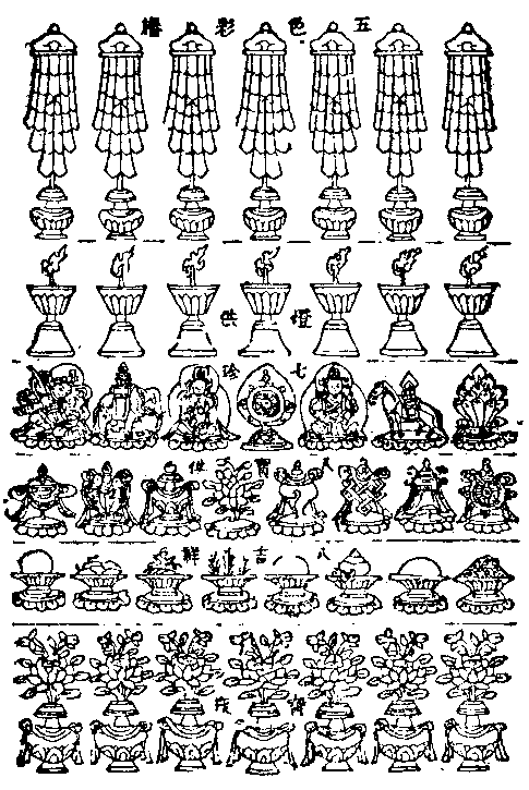 安置畢,然後陳設供養。其供養中,每一佛前,各燃七燈,各懸七首彩旛,此為要供,因救脫菩薩願文所載也。又以各品香藥所製功德水、塗香、或鮮花、或造花、栴檀香、阿嘠嚕香、都嚕嘠香等燒香,乃至諸品香麵所作香供,以各品美味為食供,諸藥為藥供,幢旛、衣服、七珍、八寶、八吉祥等,供物豐足,每作七分尤善。藥叉大將、護方土地等諸神前,無供亦可。今按本經儀軌,應獻食供,每類一分,然後將香藥水盈滿總持寶瓶,以絹帛繫項,瓶口插以菓枝而為莊嚴惟。施主須虔懇恭敬在會之比丘大眾,誦八百頌及《般若》等深密修多羅以為助法。
