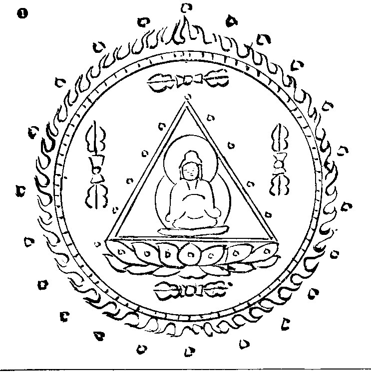作此佛部漫荼羅,作圓漫荼羅,其圓如月,中白如貝色。此圓中先作白蓮花,花上盡三角,此三角中作赤色,其中畫佛像也作何佛更問。繞三角以金剛圍之,如圖也。繞三角置點,點,標也更問。其外輪作光,如却敵形也。圓外周匝安點疑此點一一皆是本尊之位。更問。或可置字。光普皆流出者,謂想光從佛身中流出,漸次流布在三角外也。真言主,謂本尊也,遍身有光流出。前大壇中亦有三角印,與此用處不同。前者但是印,此中置佛或置印,作法圓具於彼也。