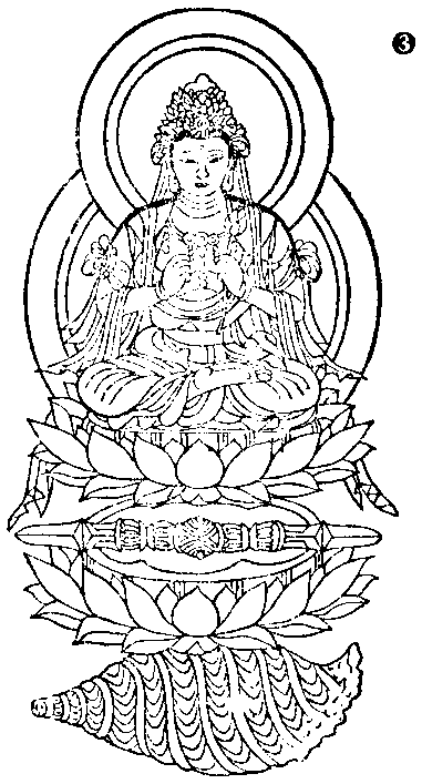 。其印如佛頂髻形,令頂高隆,傍畫兩眼形也。若作佛母形者,當如天女像,心置種子字。或可但畫印即頂髻也,或但作字耳。若佛頂為中胎,諸佛眼等為眷屬圍遶也。佛恒自身火炎中住,種子布之。謂此印於炎中住,中置種子即是也。捨三分位,謂捨三座位而置佛眼。前說菩薩部中普布種子,謂於壇中遍布之也。未說者今更說之。凡是諸菩薩,應須作漫荼羅,當作圓明之像令極白淨。於中作十字臺,臺上大真陀末尼,各置標如承珠標,其頭皆置如意珠,殊有光炎也。其本尊菩薩於十字中心置之,諸餘菩薩在次院中次第而布,更外置八部也。極白是寂靜色,當極令明淨寂然而住。此等菩薩皆能施一切願也。次作釋師子漫荼羅即釋迦也,諦聽佛子也當作金剛四方令普此金剛即是如上所說五輪中金剛輪方壇也,普者正四方之稱也,其壇黃色,極令鮮好。於中畫金剛杵三股,杵上安蓮花,蓮花黃色,花上置鉢,鉢四邊通有炎光。若作佛形者,當畫釋迦佛持鉢,又以金剛圍之,右邊置袈裟即僧袈梨,左邊置錫杖也。次五佛頂,其白繖佛頂置座,座上置印。且依本部,如佛部一切方;或依事,息災圓等也。以繖為印畫之。勝佛頂以刀圍普,若有說處即依文也。光皆流出,猶如燒鐵火炎也謂赤炎光。最勝佛頂以輪為印,除障佛頂以鉤為印摧碎,火聚佛頂畫佛頂髻形大士者號金剛也,會通大佛頂以金剛為印也。阿毘發生佛頂也。揭多佛頂是最勝尊義,一切超,以蓮為印,無量音佛頂以珂貝謂商佉也,色類應觀知謂如前說。佛豪相用如意珠為印,此名印漫荼羅。此印法等,灌頂成就物等用也。其息災等,則隨形色轉變,非此所用也。成就,皆以本尊在中觀色類,謂白黃赤等也。佛眼當作佛頂髻形,兩邊置眼。其佛頂黃色,以金剛圍之。無能勝明妃持蓮印謂空風指捻花,餘指申之,捻花指向心前持也。若諸尊有印者,依文置之;若無文,取本部主印置之,唯種子字中也。無能勝王作口印在黑蓮之上,謂畫作忿怒口,其口雙牙上出者是也。此等諸位,若以釋迦為中,則佛頂等列之居次院。若隨一一本尊中取一為漫荼羅主,即移釋迦在外,餘皆可例解耳。