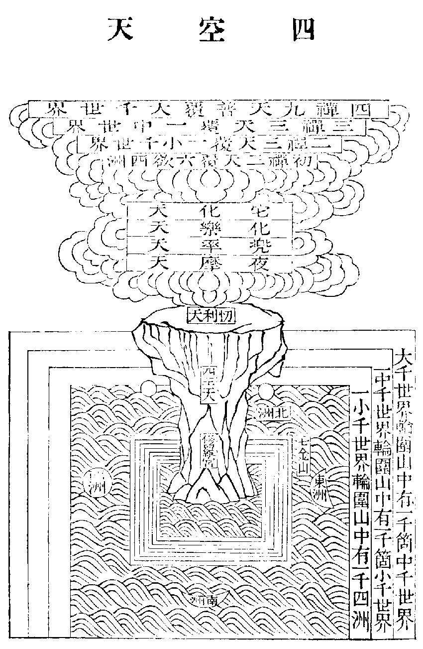 鈔:大海鐵圍者,光明覺品疏云:大海,即七重金山外鹹海也。百抄云:海濶三億二萬二千踰繕那量。一四天下,一小鐵圍。周圍三十六億七百五十踰繕那量,四邊面各五萬六千二百五十踰繕那量。四州者,東云勝身,勝餘洲故;形猶半月。西云牛貨,以牛貨易故;此洲相圓。北云勝生,壽定千歲,衣、食自然故。此洲相方。欲界六天,四王、忉利、夜摩、兜率、化樂、它化。色界十八,初禪三天,謂梵眾、梵輔、大梵;二禪三天,謂少光、無量光、極光;三禪三天,謂少靜、無量靜、遍靜;四禪九天,謂無雲、福生、廣果、無想、無煩、無熱、善現、善見、色究竟天。無色界四天。空無邊處、識無邊處、無所有處、非想非非想處。言各有百億者,已上數各百億故。此依黃帝算法,下等數法,彼有二等數法:下等,十十變之;中等,百百變之;上等,倍倍變之。十十變之。從千已上,依中等數法,百百變之。謂百小千方為一萬,若約小數,十萬是一億,謂十小千為萬,百小千為億也,則有。千箇小千為中千,方是十萬;約小數,百萬即十億,則有。十箇中千始為百萬,小數千萬。方是一億。小數有億。既十中千為一億,百中千為十億,小數千億。今有千箇中千,故有百億耳。小數萬億。下鈔云:若以小數計,有萬億也。