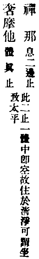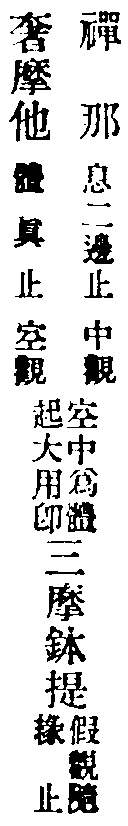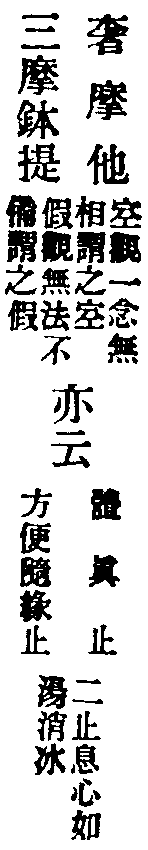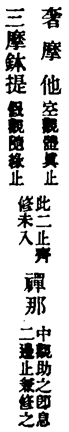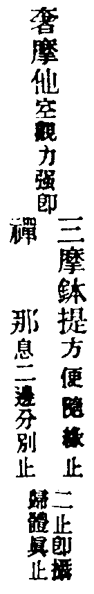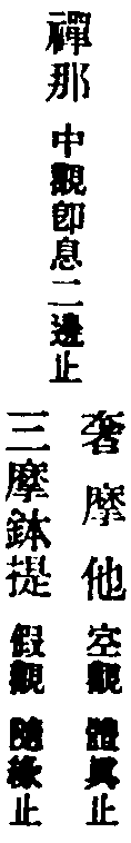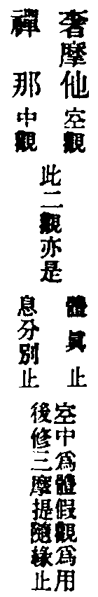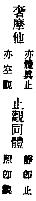 止觀云:為昏與散,翳動定明,不可隨,不可畏,隨之將人向惡道,畏之則妨修正行。此修圓覺者,先取極靜,專用止,止即定也。無明本是法性,以迷故覆理成無明,如寒結水為冰,如眼變心起夢。今用至靜體,無明即是法性,起是性起,滅是性滅,不復更論倒惑起滅。以法性繫法性,以法性念法性,常是此性無非性時,體達既成,不得其真,亦不得妄,還源返本,法界俱寂,是為止。又觀無明等於法性,本來皆空,乃至一切法無不即空,譬劫盡時,上至初禪,無非是火洞然。又如虗空藏所現皆空,又海慧所現一切皆水,介爾念起,所念念者,無不即空,空亦不可得,法界洞朗,咸皆大明,是名為觀。觀即止,止即觀,無二無別。然心神冥昧迅利,或時止之,愈馳愈散,或時觀之,愈昏愈昧,敵強力弱,鷸蚌相持,進退莫可當,方便消遣。若起決定心,強軟降魔,寂無自然深證,故云永斷煩惱,究竟成就。從此便入登圓初,住入涅槃,不生滅地,分身作佛,豈小補哉!單修奢摩他者,則是單修空觀,亦乃單修體真正也,故結云名單修奢摩他。