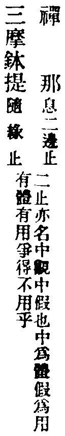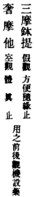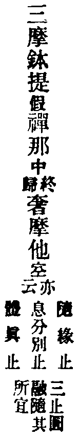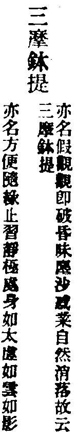 假觀屬有也。立一切法亦數法,故云三摩。三乃數也。森羅萬象,皆依圓覺妙心。一切幻化,從覺心生,如土長苗。若無覺心,幻不能生。若無幻覺,覺幻不滅。滅幻之覺如苗,幻滅覺圓,如苗歸土。皆是聖人方便門,名三摩鉢提也。次明中觀,即止觀平等。