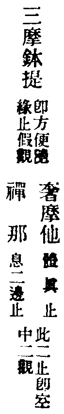 奢摩他,涅槃經名為能滅,滅煩惱故。又云能調,調諸極惡不善法故。又曰寂靜,又曰遠離。天台云:對觀名境,對止為諦。天台影望三觀立止名:一、奢摩他體真止,凝心安其理,謂之畢竟空。以三觀解之:奢摩他,空觀也,破一切法。又云:一念無相謂之空。二乘以此空破見思惑,證真諦理。大乘亦空一切相,破無明惑。今論大乘,空義也。修圓覺者,普眼章中所謂宴坐靜室,然後凝心息攀緣,取靜為行。因澄念故,用心太切,覺識煩動,於中客塵銷落。佛頂云:猶如行客,不得久住。若實主人,畢竟不去。塵垢既去,覺心輕安。澄之久久,靜慧虗明。大圓鏡中,十方世界諸如來心,於中顯現。此非論聖人果地,且在凡夫見前。須歸自心一念,虗妄浮心。荊溪云:見思王數。此是破塵合覺所在處所,不可不知。今經意且先用妙止安妄心,此亦與楞嚴同。但彼文云:返流全一,六用不行。十方國土,皎然清淨,如流璃內懸明月。乃至一切如來,密圓淨妙,皆現其中。意無殊此。下引喻結空觀。