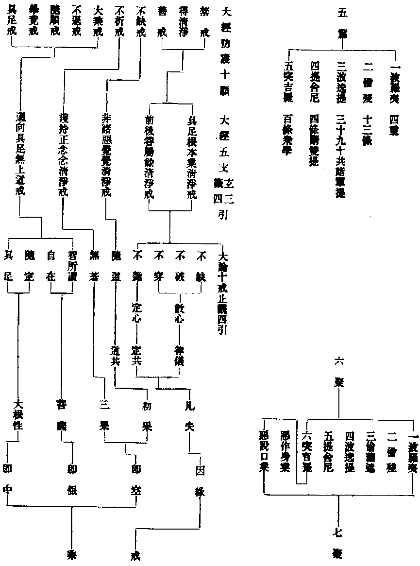 輔行四上四。問:今明衍門,何須小檢而明十種得戒人耶?答:如涅槃中處處扶律,今此亦爾,小為方便。故知出家菩薩六和十利與聲聞同,六度四弘異於小行。若在家菩薩三歸五戒咸趣菩提,況復梵網八萬威儀,七眾並資、五道通被,豈容破戒稱為佛乘?故以乘戒四句對簡云云。無作一發無捨失緣,終訖一形相續恒起。如初受時作白已後入餘心者,尚名得戒。故成論云:若人入不善心、無記心、無心,亦名持戒云云。小乘下,約大小乘以辨三聚,明無作不同。小乘經論共立三聚,謂色、心、非色非心。言心無盡等者,意明心性以為戒體。若小乘戒體是第三聚者,且依經部。若有部中還用色為無作戒體。然大乘中雖以心性而為戒體,若發無作亦依身口作戒而發,雖依身口體必在心。若先小後大,一切轉為無盡戒體。若先受大後方出家,欲在大比丘數而不失菩薩法者,則更受律儀。但於一切發得身口清淨防非律儀,無作戒體不復發也。故涅槃中五篇七聚,並是出家菩薩律儀。又若先小後大,則開小夏以成大夏。若先受大後受律儀,在小則依小、在大則依大。理雖若是方土不同,此土僧徒不簡大小。西方不爾,一向永隔。然四依出世必大小並弘,但隨物機緣通局在彼。