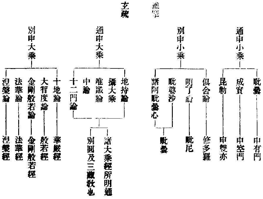玅玄六十五今依大智論標名者,一、修多羅,此云法本,亦云契經,亦線經。二、祇夜,此云重頌,以偈頌修多羅也。三、和伽羅那,此云授記。四、伽陀,此云不重頌,亦略言偈耳。四句為頌,如此間詩頌也。五、優陀那,此云無問自說。六、尼陀那,此云因緣。七、阿波陀那,此云譬喻。八、伊帝目多伽,此云如是語,亦云本事。九、闍陀伽,此云本生。十、毗佛略,此云方廣。十一、阿浮陀達磨,此云未曾有。十二、優波提舍,此云論義。部者,部別,各有類從也。經者,外國云修多羅,此云線經。線能貫穿,經能經緯,言能持法,如線如經云云。二、明分法大小者,此經指九部為入大之本,則九部是小,三部是大,葢別語耳。通而為言,小亦有記莂六道因果。又阿含中亦授彌勒當作佛記,豈非授記?經亦有自唱善哉,無問而說。聲聞經中以法空為大空,故成論中云:正欲明三藏中實義。實義者,空是阿毗曇所不申,而成論申於空,空即廣經,當知小乘通具十二部也云云。有人言:大乘九部,除因緣、譬喻、論義。大乘人根利,不假此三,斯亦別論通語,大乘何得無此三經耶?有經言:小乘但讓廣經,一部有十,一部無方。廣者,大乘說如來是常,一切眾生皆有佛性,正理為方,包富為廣。又理融無二,亦名為等。聲聞中所無,但十一部耳。若言小乘定有九,不應復有十一部。既取十一,亦通有十二,為緣別說,或讓三,或讓一,以判大小乘云云。