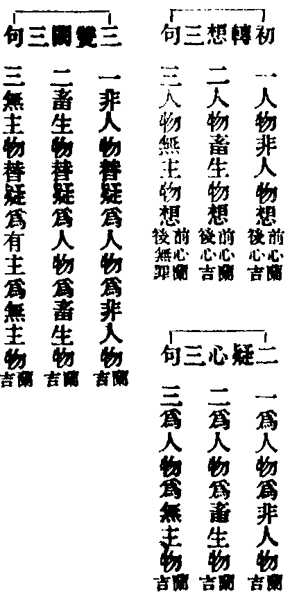 總判中三初分前後業異如下示結犯分齊或下指境想差別境交即婬對下染字離處是盜對下奪字文略殺妄可例知故。