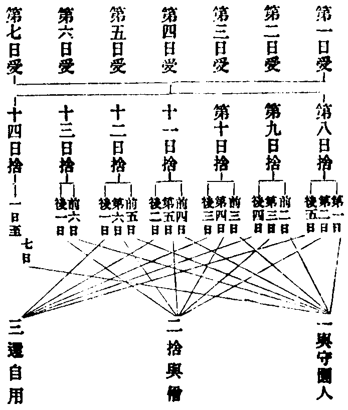 釋注中初科二初點總意注云白治罪者懺主作白和僧犯者三說悔罪就下釋三位此約初日受藥乃至七日日日受之至第人日初日限過二日已下並相染犯捨已俱還故分三判文中且據八日捨者為言初位二日得者體非過限由相染犯故聽僧食二中初日過限即是本犯由具宿觸等過不聽僧服故與守園入即監護僧寺者三中三日得者亦即染犯至第八日始得六日故聽還主言明日還者前云長藥不必隔宿今以意詳或是兩通或且循古若據藥體正滿七日故云理合說淨但隨能染越過七日故令外用不得入淨乃至第七日受者雖經一宿亦同此判此中展轉者即約七日日日受藥至第八日並相染犯或即日捨懺或至十四日捨還三判具缺不定是故受捨並約七日明之古記錯解後學難曉略為圖示。