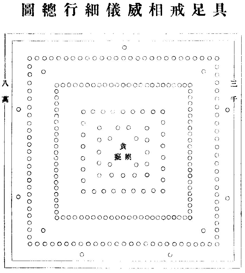 二百五十,具足戒法。以行住坐臥四威儀,各有二百五十,合為一千。循過去、未來、現在三世,為三千威儀。以此三千,配身口七支,成二萬一千。以此二萬一千,復對治貪瞋癡及等分四種煩惱,為八萬四千細行。此即八萬四千律儀也。言八萬細行者,舉其略也。若論生起者,則棄為根,殘為株,捨墮為枝,逸提為莖,眾學為葉,悔過為花,滅諍為果,不定為皮膚筋節。持之則七覺為花,四聖為果。毀之即身口七支為花,四惡趣為果。
