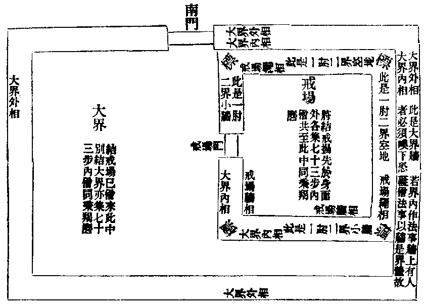 今依此圖,便有三相。若唱大界外相,必須在外唱之。周匝屈曲,一如前說。若在牆內唱者,至西南兩面自然地邊,則與大界內相共合,便不分彼此之異。若無戒場者,得從內唱。若唱大界內相,東北二邊有小牆者,應傍小牆東南角外角唱穿小牆西入,還傍大界南牆,至西南角內角,還傍大界內西牆直北穿小牆過。然後屈曲唱之。戒場外自然地者。東北兩邊,即用小牆為自然地。西南兩邊,則用一肘繩㯹外為自然地。若大界內先無相者。應竪㯹杙,以繩連之。當於戒塲東南角離大界南牆尺八地,傍小牆基下釘一大杙。直至西牆。離西大牆內尺八地又釘一杙。直北至小牆基下復釘一杙。亦令遠大牆一尺八寸。仍以繩連此三㯹外為自然地。其戒場相者。東北兩邊,則以小牆內畔為戒塲相。西南兩邊,則用繩㯹內畔為戒塲相。答:此繩㯹久固不壞者。人在自然地內,不妨戒場內得成法事。以識知界相故。若此繩㯹破壞無者,後時客比丘來,不知界畔,容可向自然地內坐立。或來去不定。恐破僧法事。臨危事嶮,可懼之甚。無知如此。若大界牆基闊二尺已上者,唱此一肘自然地,縮入大界牆內,最為穩審。以界是色法入實無妨。計一肘自然地止可尺八,殘有二寸,便是大界牆體,足辨兩界之相。上來所明,聊寄一物作此界體。而界相眾多,未必如圖。至時稱事任補茲處。於戒塲門內亦應屈曲唱出。恐有繁重,不能更述。若結二界,應先結戒場後結大界。故五分亦令先結。若先結大界者,當捨已前結戒場後結大界。又毗尼母云:外更不結大界,直結小界者。亦不得受具。問:先結大界,後結戒場成不。答:五分應捨更結。故知得成。以不成後法,故須解之。五百問事云:後結戒場者。於中受戒,恐無所獲。又云不知同於未制。賴有此路,則通僥倖。義云:今時結者,濫法眾多,不可具述。且辨成文,非義自露。如前聖教所明,則戒場先定也。既知如是。若欲唱結,各當界為之,不得彼此遙作。便自然界僧盡集戒場所。令一舊住比丘起,具修威儀,立唱云:大德姉僧聽。我比丘比丘尼某甲,為僧唱戒場四方小界相。從東南角內㯹傍繩西下,至西南角內㯹。從此傍繩北下,至西北角內㯹。又傍小牆東下,至東地角內角。從此南下至東南角內㯹。此是戒場相一周訖。一說上座問僧集和合已。又問未受具者出。僧今和合,何所作為。答:結戒場羯磨。大德姉僧聽。此住處比丘比丘尼某甲唱四方小界相。若僧時到僧忍聽。僧今於此四方小界相內結作戒場。白如是。大德姉僧聽。此住處比丘比丘尼某甲唱四方小界相。僧今於此四方小界相內結戒場。誰諸長老大姉忍僧今於此四方小界相內結戒場者默然。誰不忍者說。僧已忍於此四方小界相內結戒場竟。僧忍默然故。是事如是持。