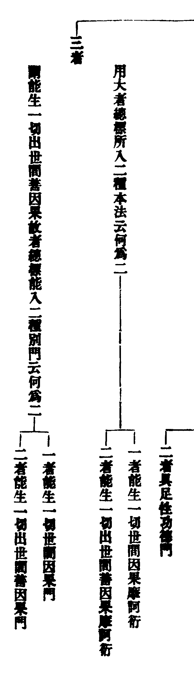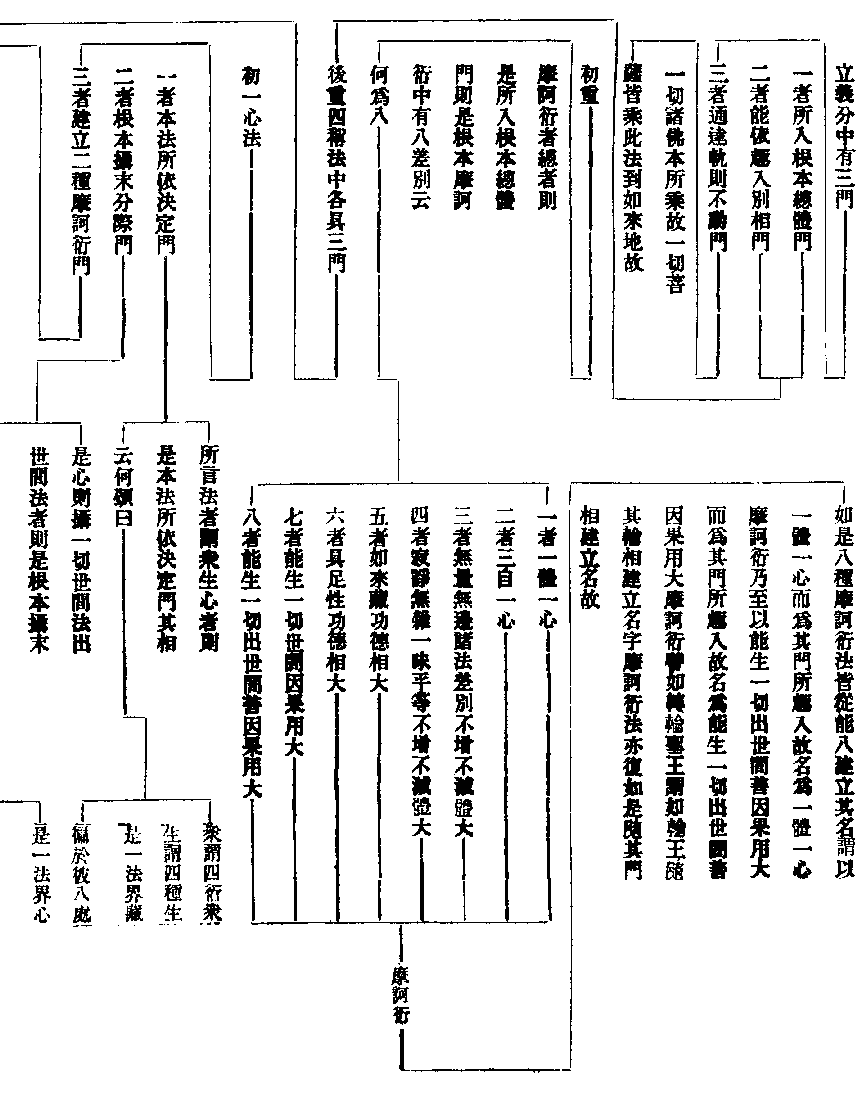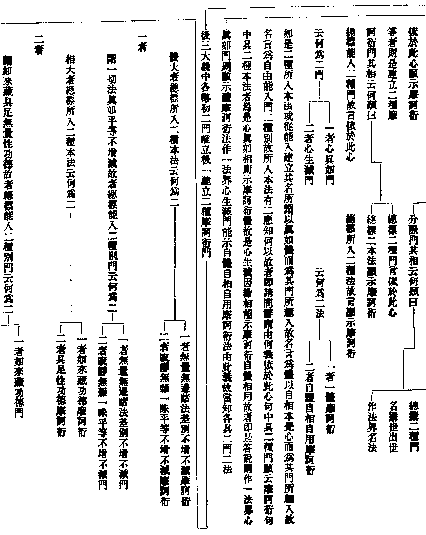 所出圖目,庶知梗槩。更重述釋,有其二門:初依現文,後伸異義。初中有三門:一者所入根本總體門;二者能依趣入別相門;三者通達軌則不動門。初二種門有其兩重,圖中雖已標具,今復委悉指陳。一初重門法摩訶衍者,總者即是初重所入根本八法。雖此總言通於兩處,由後重法下文別說,是故此唱且屬初法。法為所入,門即能入;法為體性,門即義用。以用隨體,更不別明。說有等下四句論文,不唯作後重標舉,抑亦為初重釋成,蓋亦望上及下臨故,釋師於是不偏指屬。二後重門法二:初一心法,後三大義。初中有三門。所言法者,謂眾生心,即是第一本法所依決定門,二種本法決定依於眾生心故。是心乃至出世間法,即是第二根本攝末分際門,根本一心總攝枝末二門法故。依於乃至自體相用故,即是第三建立二種摩訶衍門,依眾生心建立顯示真如生滅二種門故,復由二門顯示趣入二種本法摩訶衍故。後三大義中所言義者,則有三種等,亦如前法各具三門,舉後攝前但影後一,建立二種摩訶衍門。言體大者,總標所入二種本法,謂無量無邊諸法差別不增不減摩訶衍,寂靜無雜一味平等不增不減摩訶衍,謂一切法真如平等。不增減故者,總標能入二種別門,所謂如本法名門亦爾故。此具顯示二門二法四種法相,如是相大、用大門中亦各具四,例前體大說相可知。問:此立義分備標本數三十三法,於中何故不說不二摩訶衍耶?答:如上所陳三十二種,則是總別門法,形對差別顯示不二,大乘離於觀待絕諸差別,以為諸法通所依故。既明能依即己影示,由能所依不相離故。問:以本影末、以親影踈,於理可爾。其不二法,眾乘本體、諸教通宗,一切行人之所歸趣,何不分明開示,反以影略顯彰?答:論不云乎:是法極妙甚深獨尊,離機根故、離教說故。三、通達門,文明不釋。上依現文竟。