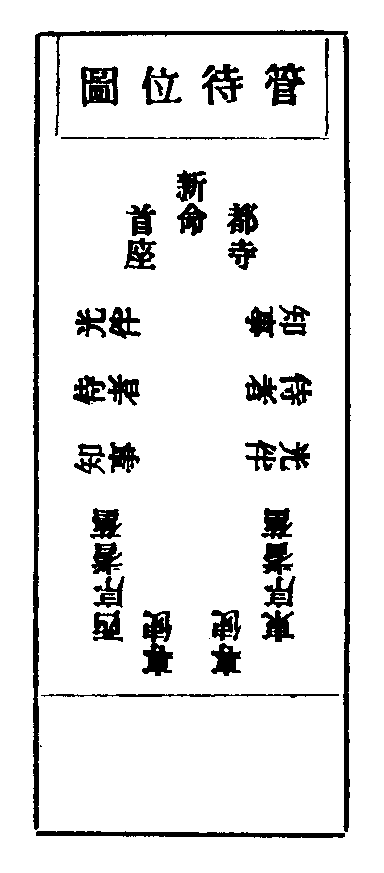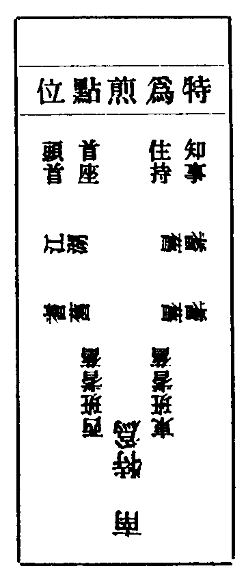 頭首乃叢林表率,務擇才德相當者為之。近競奢侈飲食財物為事,使守貧抱道之士愈甘退藏,法社何能振興?知事乃山門重任,務擇廉能相稱者充之。古制大剎不過五人,今行院額設亦有定例。近多徇私,雷請歸庫。祇圖豐己,未甞念公。常住漸虗,法門日弊。原究其始,咎歸誰乎?若兩班職事滿日,待昏鐘鳴,同詣方丈,插香觸禮一拜,稟退知事,就納庫記鑰匙。其中或有再留者,住持就便委曲和會,不允其退。次早親到彼寮,侍者燒香點湯勉留。若新請兩班,不可率爾。與其不得其人,不若不求其備。若果相稱,未允所請,須委心腹人展轉和會。惟首座、都寺,必住持親往和會。至請之時,住持須具所請人目,并舊兩班耆舊,令客頭行者請粥罷會茶。其舊知事於內僧堂前,候行粥徧,直日人出,則入聖僧前問訊,燒香三拜,從聖僧厨後至椎邊,鳴椎一下云:某等昨蒙方丈和尚令,歸庫司充知事,一年已滿,心力勞倦,告退歸寮,謹白。再鳴椎一下,往住持前,觸禮一拜,巡堂一匝,中間問訊而退。粥罷,行者催請新舊兩班及耆舊新兩班或請客侍者請至寢堂,住持接入坐。侍者燒香茶畢,住持躬起燒香,眾起立,伺住持歸位,皆坐。住持白云:前兩序告退,此務不可缺人。今講某人充頭首,某人充知事,逐一標名清訖。所請人進前遜辭,住持與大眾歸左邊,所請人歸右邊,對觸禮一拜。敘寒溫畢,侍者揖新兩班歸特位,朝裏列於兩邊坐定。侍者燒特為香,即至特位前問訊,退歸中立。待行者下湯,侍者再到特位前揖湯,鳴法鼓一通,復歸中間問訊,燒光伴香一炷。湯畢,鳴僧堂前鐘,集眾送新兩班歸寮。先住持送,次舊兩班賀,次大眾賀畢,住持同大眾送舊兩班歸寮畢,新兩班懷香詣方丈拜謝,令堂司行者引報處寮。住持請草飯、湯果、管待等如常式。維那、僧知事退職,亦僧堂行禮,與知事同。
