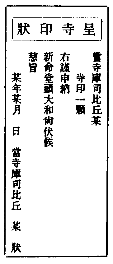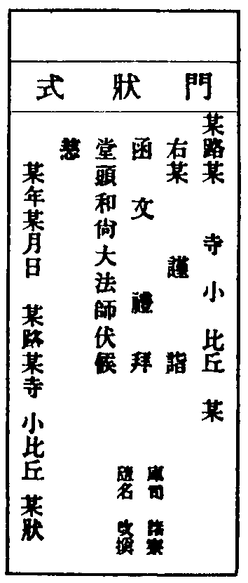 若求掛搭,再詣侍司問訊。少坐,起身稟云:某等慕仰和尚道風,特來依栖座下,拜煩高侍通覆。侍者顉話,具寫求住人諱,呈覆方丈。如允,侍者次第求住持榜頭下堂司。維那令行者請求住人茶,接入燒香。獻茶畢,參頭起稟云:某等適奉方丈慈旨,令依附左右,伏望甄錄。答云:山門多幸,同守寂寥。參頭同眾各取度牒,遞與維那,上戒臘簿。隨即付還,送出歸下處。各書方丈兩序寮舍門狀,各人各寮一紙。不得共名,亦不可白帋標頭具名。狀如後式。復各備大香一片。近有率香錢省,是杜初心入道之路,非佛祖流通之心。凡百有位,當力免之。次早,維那令堂司行者伺探方丈,有暇即報。求住人引到方丈通報,排立寢堂。候住持出問訊,參頭進云:請和尚趺坐。各人進前插香。初展云:某等仰慕和尚道風,特來依栖。極荷收錄,下情不勝感激之至。二展云:即日共惟堂頭大和尚尊候,動止多福。大展三拜,住持略答一拜。求住人收具,問訊而退。次引至庫司諸頭首寮,通門狀人事問訊。略插香,不受問訊講禮。次各寮各齋人事。堂司行者報云:新歸堂人事,今止傳語,多不相接,皆非禮也。若舊識鄉曲,次日一一重訪。即歸下處,伺頭首還禮。或不回禮者,非也。
