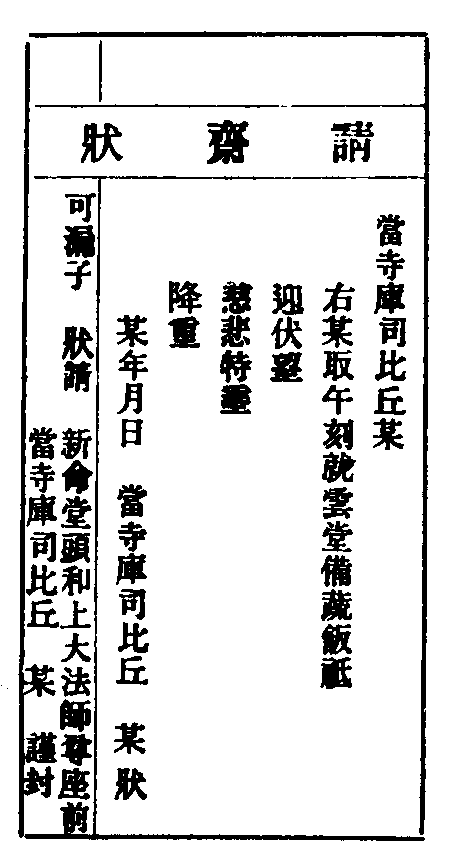 方來兄弟,既掛塔歸堂,行禮已辦,不宜久寓下處,必遷齋舍。脫著看讀,寫遷齋狀,詣堂司詳稟維那云云。即撿齋舍簿,或未遷齋,或某齋人少,相議酌量,寫齋名標,貼於狀上。再稟維那備申,即詣侍司。侍者同上方丈呈狀,住持題判,發下堂司。堂司行者,關請錀起,開齋門,對簿交點什物、卓凳、牀具等頂。若後請假,亦須稟維那,同堂司行者,對簿交割什物完備,方許給假。近失點對,使每年措辦,有揖常住。