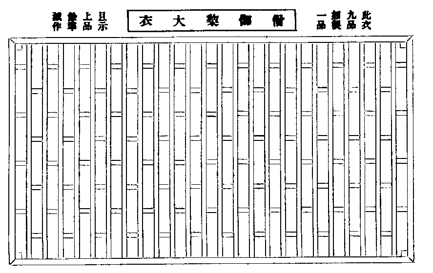 一、僧伽梨義翻雜碎衣,以條數多故。亦名眾集時衣,入王宮聚落乞食說法時著。又大衣分為三品,每品有三。○下品九條、十一條、十三條,兩長一短。○中品十五條、十七條、十九條,三長一短。○上品二十一條、二十三條、二十五條,四長一短。二、鬱多羅僧此云上著衣,即七條也。兩長一短,名中價衣。從用云:入眾時衣,禮誦齋講時著。三、安陀會此云中宿衣,謂近身住也。五條一長一短,名下衣。從用云:院內行道雜作衣。○衣名福田者,僧祇律云:佛住帝釋石窟前,見稻田畦畔分明,語阿難言:過去諸佛衣相如是,從今依此作水衣。增輝記云:田畦貯水,生長嘉苗,以養形命。法衣之田,潤以四利之水,增以三善之苗,以養法身慧命也。田衣之相如圖。