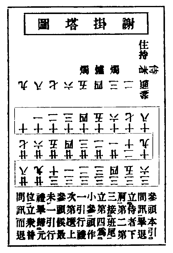 凡求住已定,即謝掛塔。如住持以禮繁,待後來求住者,一同謝掛塔。如夏前歸堂者,在四月八日謝。如祖忌齋歸堂者,在十一月二十日謝。其戒臘在上者為參頭。參頭當具小圖習儀,三人一引,每引一人為小參頭,詳記詞語。仍令堂司行者,率各人香錢五伯文,煩侍者到方丈回香。約有幾引,回香幾片,就稟擬定何日謝掛塔。至日,侍者就寢堂設香几爐燭,參頭領眾依圖列立。參頭同侍者入,請住持出,歸位立。參頭同眾齋,問訊畢,參頭進前稟云:請和尚趺坐。退右足,側轉身,於香几右邊空處出,行過復位。齋,問訊畢,參頭同本引三人問訊。參頭進爐前小問訊,懷中取香,雙手插香右邊空處,過復位。三人同門訊展具,住持展手約免之。參頭進云:某等宿生慶幸,獲遂依棲,下情不勝喜躍之至。退歸位,問訊,再展具。住持復約免收具,再進前云:即日時令謹時,恭惟堂頭和尚尊候起居多福。退歸位,門訊,觸禮三拜。住持略答。第一引問訊過,左邊接班尾,三三趲上插香詞禮並同。禮畢,普問訊而退。次日,方丈請點心。