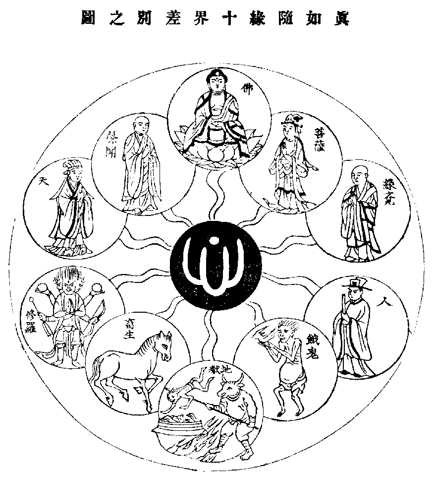 客曰:云何名為真如隨緣十界差別門?余曰:前引華嚴能隨染淨緣,具造十法界者,正以法界圓融之體,真如不變之性,如君子不器,善惡皆能。圓頓教旨,無功用道,極要緊處,全在此能之一字上建立。若它別教所宗,但中佛性,惟具善而不具惡,其於文經為善之事,或者能之,若於武緯征伐之事,則不能之,何足以𫁉才無不具,藝無不就,成德之士哉?若圓頓教旨所明,真如不變之體,既具十界善惡之性,故未隨緣時,則居然不變。若隨緣時,而有十界染淨之用,謂能隨染緣造九法界,隨淨緣造佛法界。十種法界,既是性具,又是能事,惟彰己能,何過之有?非比淳善之人,一切惡事,本非所能,被惡人逼,強令作惡,慮其名德俱喪,則慚恧無地,斯為過矣。然此一門,宜分因果,因論方修,果論感報。方修之因,復有二種:一起念名造,二搆作名造。起念名造者,如世人日用,根塵相對,凡起一念,必屬一界。一界生起名事造,九界冥伏為理具。以冥伏故不有,以現起故不無。全造而具,故不有而恒有。全具而造,故不無而恒無。不有不無,實相理顯。故善觀一念者,三智一心中得矣。二搆作名造者,依此真如所起一念,漸漸增長,搆造染淨二因,成業性故。現起冥伏,義同上說。是故能善觀一心為界者,三智亦一心中得矣。果論感報者,約三世論,方修之因,若在過去,則感報之果在現在。若方修之因在現在,則感報之果在未來。又方修之因,有轉不轉。感報之果,有定不定。轉則不定,不轉則定。如一念貪心起,為地獄因。若能改格前非,慚愧懺悔,或轉為人天,或轉為四聖。在其用心勵行之不同,下當列圖,具明其相。使閱者有所照,非成是焉。