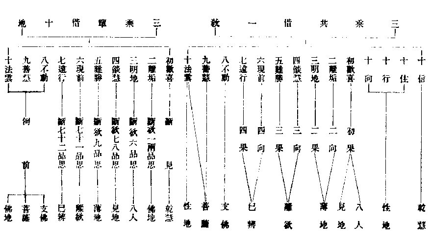 此是三乘共位。若備盡通教位義,先達以五別三借說栝諸文:一、三乘共備別教始終位次;二、單借別教十地,亦三乘共位;三、別為通教菩薩借別一教此是三借,是如止觀第六破思假中輔行六上釋。然止觀前二借合作一科,皆共位,故釋中復開為兩;第三借作一科,獨菩薩,故下復圖示之,別為菩薩立忍名,別明菩薩燋炷十地具如玅玄四(三十),此名二別,并前三借共為五別。大品更說十地菩薩為如佛輔行明通二種如佛,以釋大品:一、別為菩薩立忍名,第十名菩薩地,到共位佛地,故云如也。又被接人至十地破無明,能八相作佛,似通教佛,故云如也。釋籤亦明圓教觀行如佛,相似如佛,但非今通教所論,及被接等,俟下略明。先示三借。