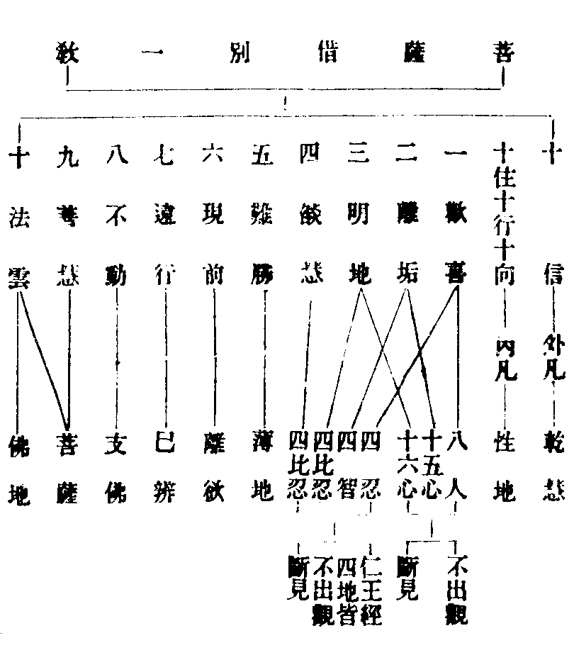 八地入無功用,如華嚴妙覺位,但破一品無明,未見所出。至六地斷思與羅漢齊者,取十度義,以第六般若空慧斷惑故也,如止觀第六借位中云云。十度者,六外加願,智、力、方便。三賢者,別住、行、向,住果報土,義則屬圓。此仁王經偈文,別教更有縱橫之義,非此可盡。