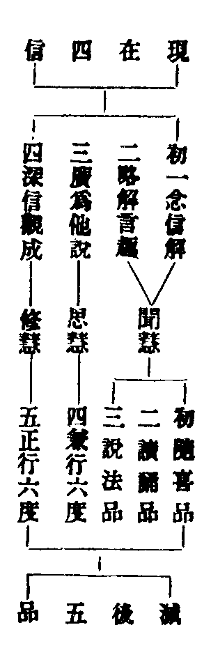 法華但有五品六根,瓔珞具明五十二位。妙樂三四云:若云圓位,六即亦足,何須更列四十二耶?以分真位長,故借別位分其品秩文。昔賢據此,謂圓教本無位次,但借別顯圓。今謂妙樂意以五十二位在經論中多被別人祖師用釋圓位,故云借耳。又有云:五十二位名雖在別,圓亦同用以分深淺,豈可圓教全無位次?大品四十二字,華嚴初住八相,法華五品六根等,皆圓位義也。故曰:顯一理則始終無二,存諸教則因果歷然。既稟教修行,安得無位耶?妙玄五又揀諸文開合有四:一、開前合後,如大經三十三天住行向為三,十地等妙為三;二、合前開後,如仁王十四般若合三十心為三,十地為十,等覺為一,總十四忍轉入佛心,名之為智;三、前後俱開,如大品四十二字對四十二位;四、前後俱合,如法華開示悟入及遊四方對四十位。又楞嚴明位有六十,前加三漸次名字即,及立乾慧地觀行即,向後地前立四加行,并常五十二,共成六十