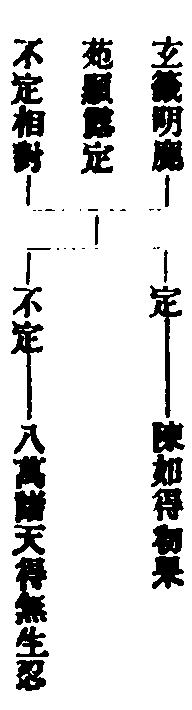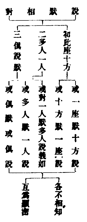 【■記】義加者,此說默相對圖中。初二兩對,玄文未出。釋籤曰:文略耳。既言俱默俱說,理合如前頓漸三法相對,故此圖依義加補也。然妙玄下文曰:各各不相知,互為顯密。雖復如此,未盡如來於法自在之力,但可智知,不可言辯。應知如來三輪不思議化,難以測度,今略判成秘密不定耳。