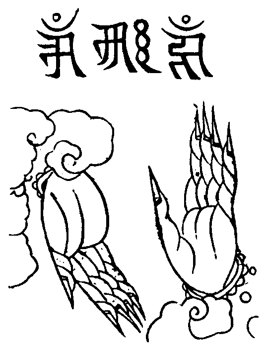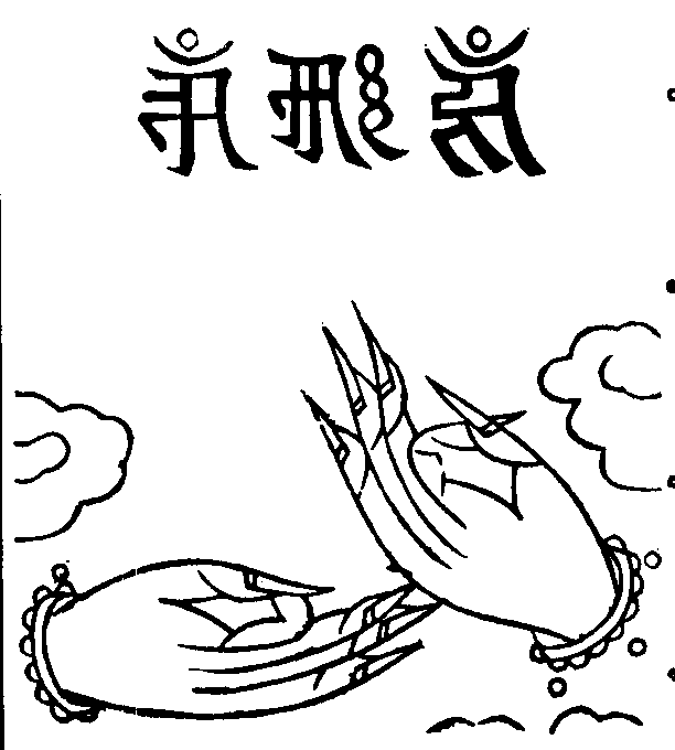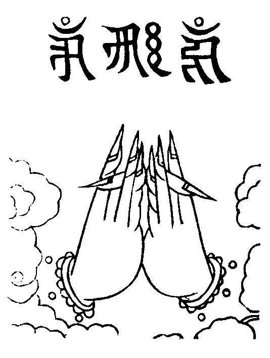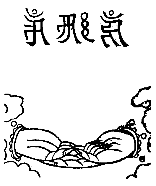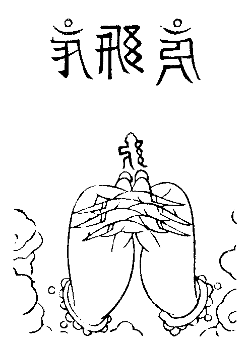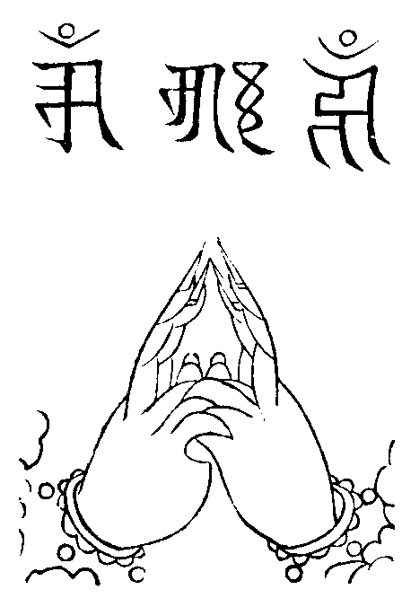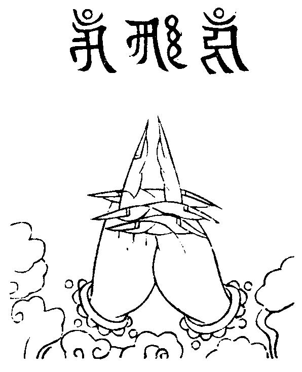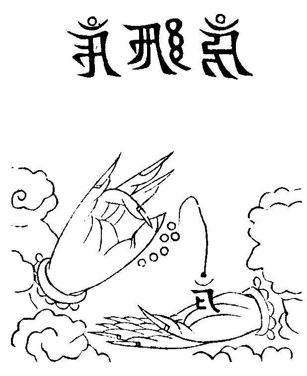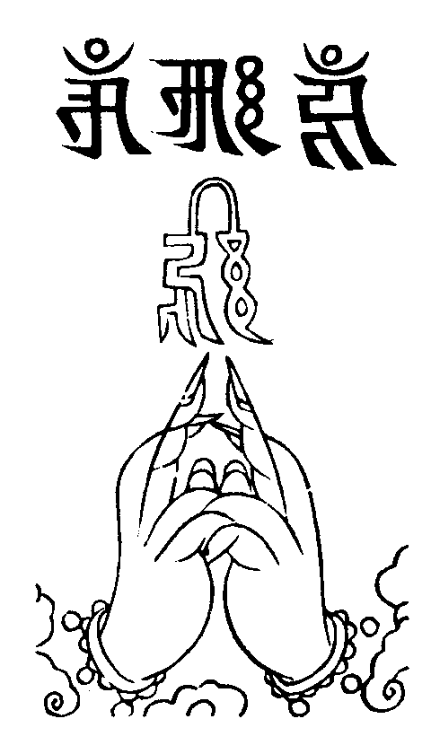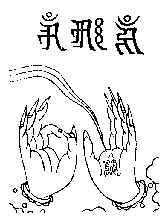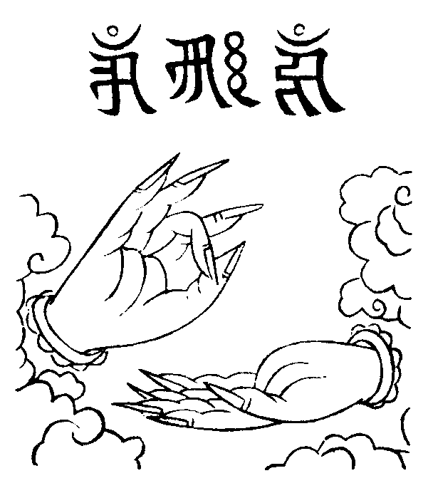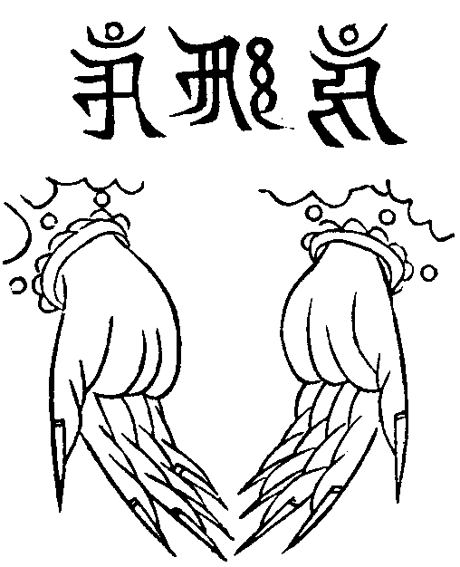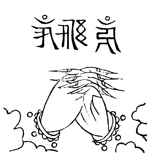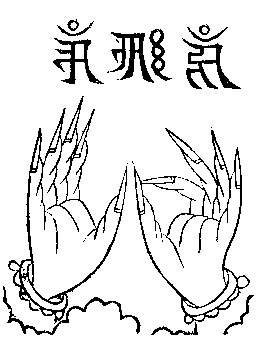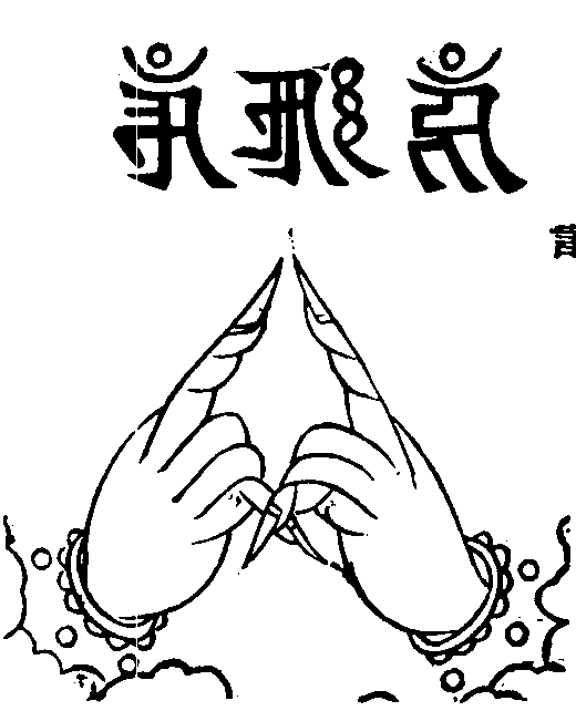 左羽作拳相竪,力度當胸竪,右手屈進度,誦三寶真言曰: