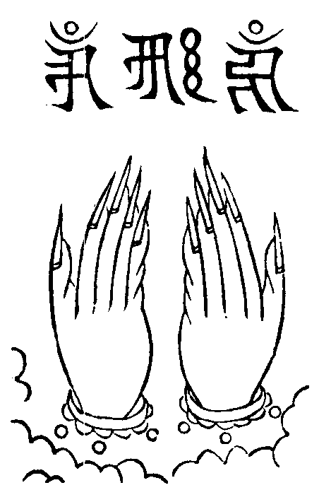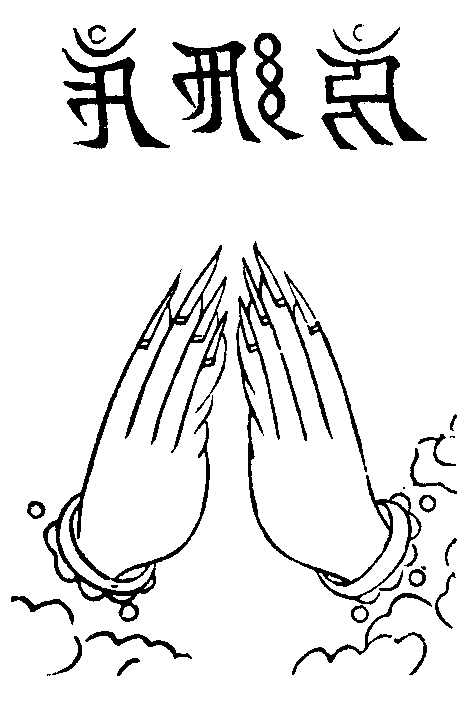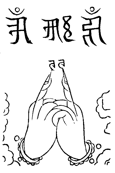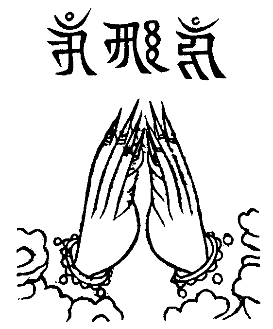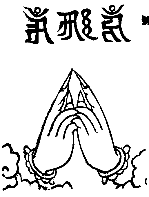 誦之七遍,其印以兩手外相义合掌,以右壓左置於頂上。凡作供養應具此法,及奉瑜伽皆以真言手印持誦,及以運心合掌置頂,方成圓滿供養之法。