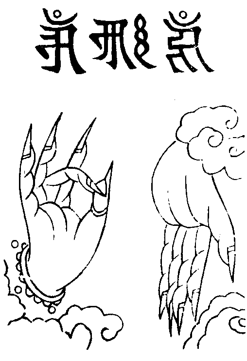 右羽曲竪拳,忍禪度相彈,左掌仰上五指舒,誦密呪。