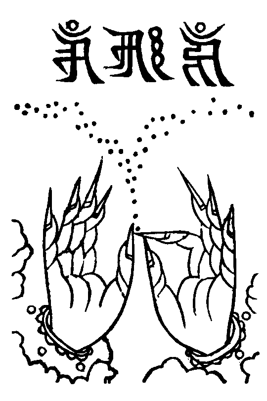 語諸佛子:今為汝等作印呪已,由此印呪加持威力,想於印中流出甘露,成於乳海流注法界,普濟汝等一切有情充足飽滿。