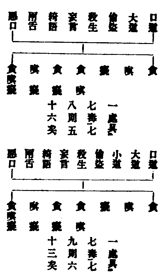 十惡業十善反之一殺二盜二邪婬四妄語五綺語六兩舌七惡口八貪欲九嗔恚十邪見。