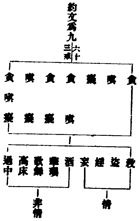 就業非情十二(九十一戒)十五(一百五戒) 殺盜婬口婬大婬小妄綺語兩舌惡口酒花瓔歌舞高床過中捉寶。