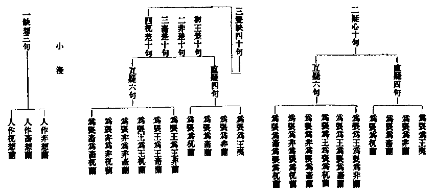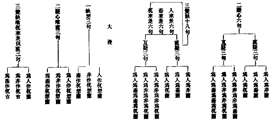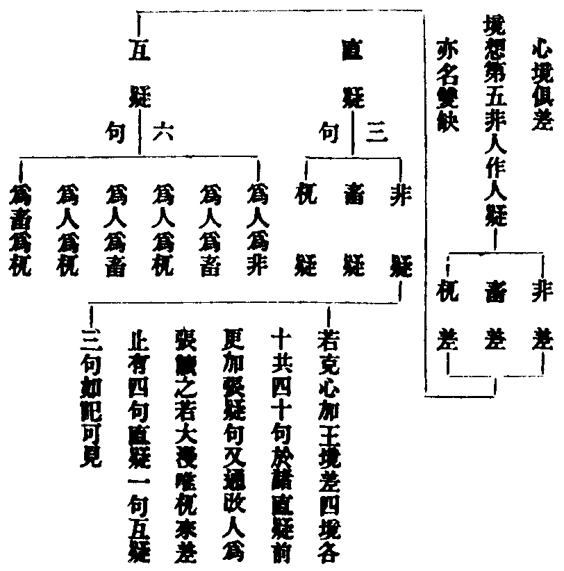 詳上圖中,一違祖教,二乖義意。且直疑為張為王等句,乃緣二境,互涉起疑,豈得云直?又詳互句,牒境重重,不遵祖典,穿鑿太過。又小漫中,直疑濫互,如前已行。互疑二句,上半本異論互,下半就異論互,與記何殊?豈特改作,公違師訓?又大漫中,唯立直句,據何文義?疏云:餘大小漫,心境缺想,並准克論。句法多少,約義斟酌。直互大槩,須準繩規。設謂疏無明文,理義亦難偏局。如三趣通害,杌替其處。或直緣杌起疑,或緣非杌互起。機情萬別,心念千差。如何一定,單雙二缺,唯論互三?至於作句,又濫於互,全成戲論。記圖所立,於教有憑,於義周足。直於一境上起,互收二境,乃至多境。但使心涉彼此,名名為互,豈非義足?後紹興年中,有會稽定師,亦出圖相,大略與上欽師是同。但於大漫,想疑各唯一句,與上為異。今但破欽師之義,定師所出,自然無取。學者亦不須傳,從費紙墨。請知之。