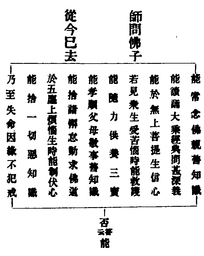 大德一心念!我某甲眾等,求諸佛菩薩,欲受菩薩戒。今請大德為我作審戒阿闍黎,願大德為我作審戒阿闍黎。我依大德故,得受三聚、十無盡清淨戒。慈愍故!慈愍故!大慈愍故!
