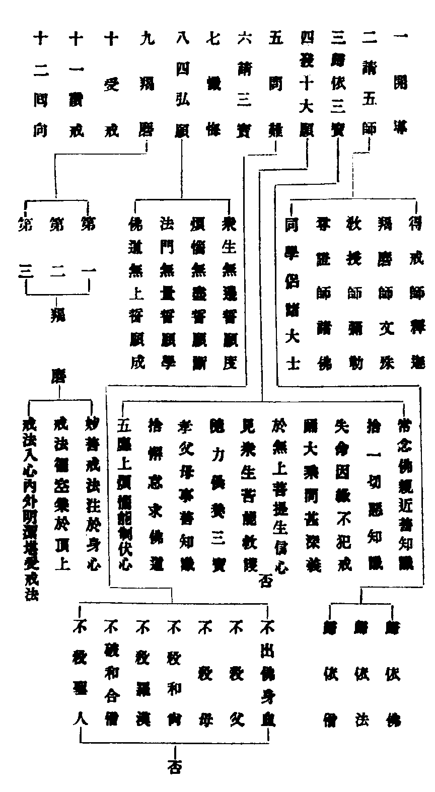 重樓四級,次第而登。爾能欲登三級之重樓,秉受具圓,必須從前所受十戒之相,一一陳白。若有犯者,如實發露懺悔,不得覆藏瑕疵,隱覆在心,可舉向人悔過。若不如斯發露,罪乃日增,不堪受汝戒法。諸沙彌等,我今如實問汝,一一實答。諸沙彌等,從受十戒,若久若近,所犯其戒,從實發露,令汝如法懺悔,淨其器皿。諸師坐前,白四羯磨,方受大比丘戒。若不如實懺悔,不容進受,並名非法,不得戒也。審戒師亦令禮懺雪罪也。眾舉往昔所造諸惡業云: