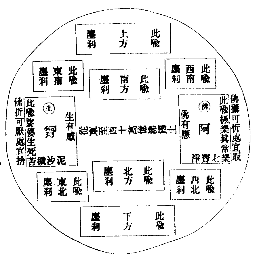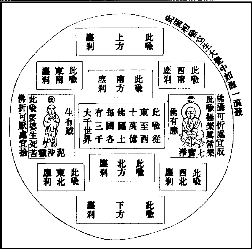 此一大方相,喻大覺不生滅之真心也。心量不可為喻,今姑以方相擬之。此一圓相,喻十方無邊虗空也。此十箇小方相,喻十方各微塵數世界也。此人身中心字,喻汝今𮌎中所蘊六塵緣影之妄心也。此妄影心在我身中,身在世界,世界在空,空在大覺本然真心之中。故知此東穢西淨二土,實境兩形,遠隔十萬億國土之外,豈在汝今虗妄緣影心中?佛祖有云:惟心淨土,本性彌陀者,正在此以方相為喻,能含裹十虗大覺不生滅真心中。若謂在汝即今妄想緣影心中,可謂惑甚。楞嚴云:譬如百千澄清大海,棄之惟認一浮漚體,目為全潮,窮盡瀛渤,此是迷中倍人。即此義也。又云:十方虗空生汝心內,如片雲點空。況世界在空,豈能離我本然真心也?又云:空生大覺中,如海一漚發。有漏微塵國,皆依空所生。如是則淨穢等土不離真心,又何礙於著相求生耶?若能了遠即近,求即無求,自合理趣。此真妄二心,古人廣有妙釋,不能具引,行者可不鑑乎