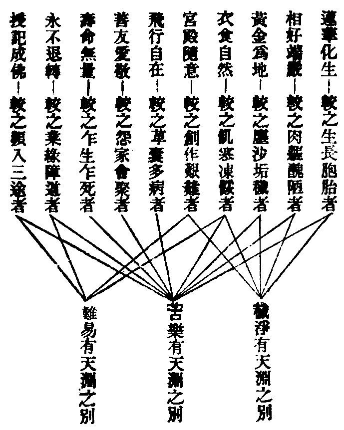 佛問阿難:譬如丐者在帝王側,形相容儀可相類否?阿難答言:丐者羸陋醜惡,安可比擬帝王?佛言:帝王雖貴,然較之轉輪聖王猶如丐者。轉輪聖王僅王四天下,然比忉利天王,又百千億倍不可以及。忉利天王比第六天王,又百千萬倍不可以及。第六天王比阿彌陀佛剎中諸菩薩、聲聞、諸上善人,又百千萬倍不可以及。